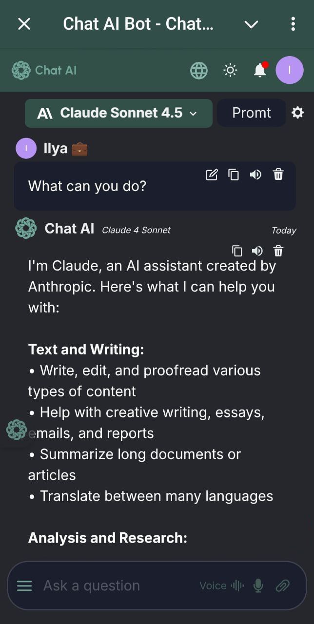 Claude AI Neural Network – one of the most serious competitors to ChatGPT, which is restricted for use in Russia. The program generates texts, creates documents, letter templates, responds to queries, writes stories, and more. To access the AI tool, you will need a VPN and a foreign phone number to receive the verification code. But there is a simpler way to work in the chatbot. Through the Chat AI service, you can join Claude 4.5 and the latest version of artificial intelligence – Sonnet for free.