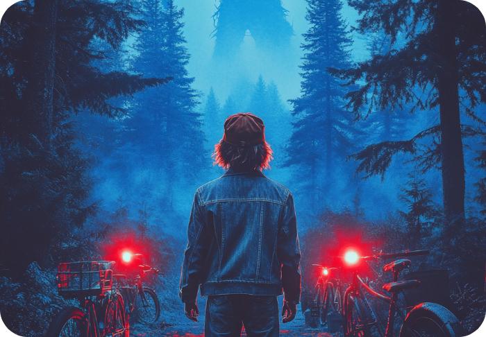 Ultra-realistic poster in Stranger Things style: hero in dark foggy pine forest, Demogorgon silhouette behind, red neon, 80s denim jacket, retro cap, bicycles with headlights, 8K, no cartoonishness or artifacts. Try It