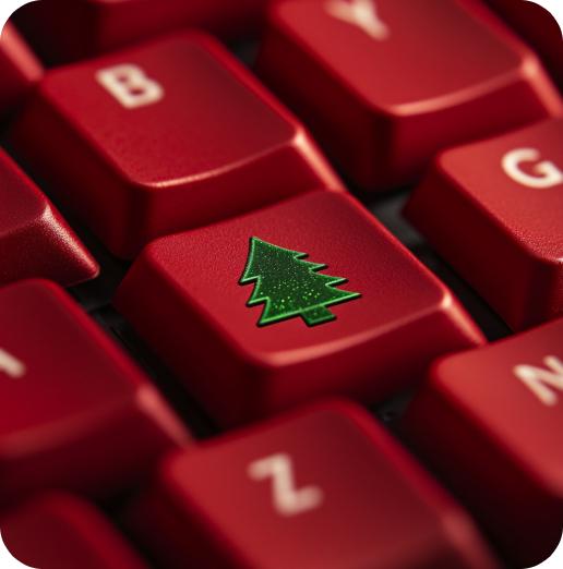 Macro photo of red mechanical keyboard: Enter key with green Christmas tree in sharp focus, other keys slightly blurred, backlight, Christmas gaming STYLE. Try It