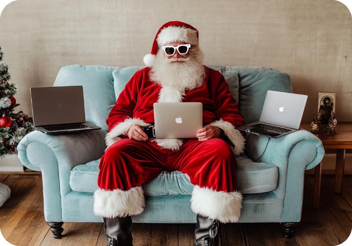 Santa in red suit and white beard sits on a light blue velvet sofa in white futuristic glasses, with iPhone at his face and several MacBooks around, minimalist modern interior, natural light, funny techno-Christmas scene. Try It