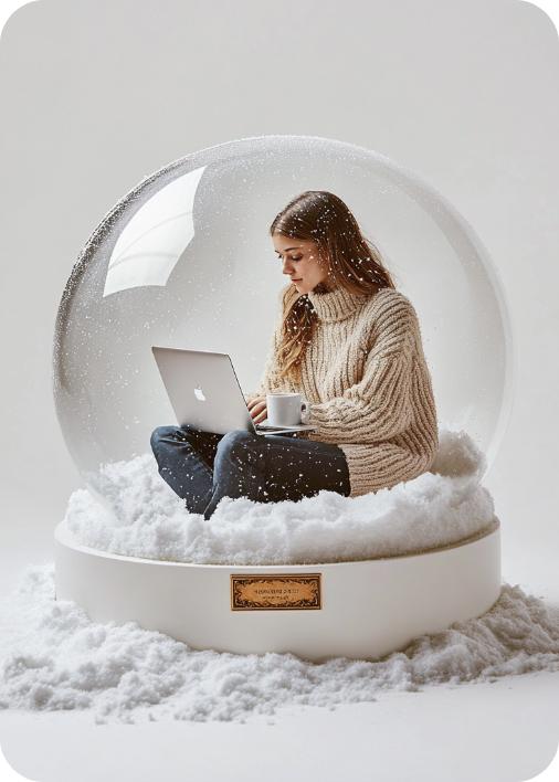 Giant snow globe on white background. Golden plaque on base. Inside realistic girl in sweater, with MacBook and coffee mug, sitting in winter landscape with fresh snow, soft light, high detail. Try It