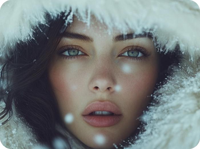 Ultra-realistic cinematic winter portrait. One woman in a snowy arctic environment, cream fur coat with large fluffy hood. Close-up of face in hood, dark hair, snowflakes, natural winter blush. Try It