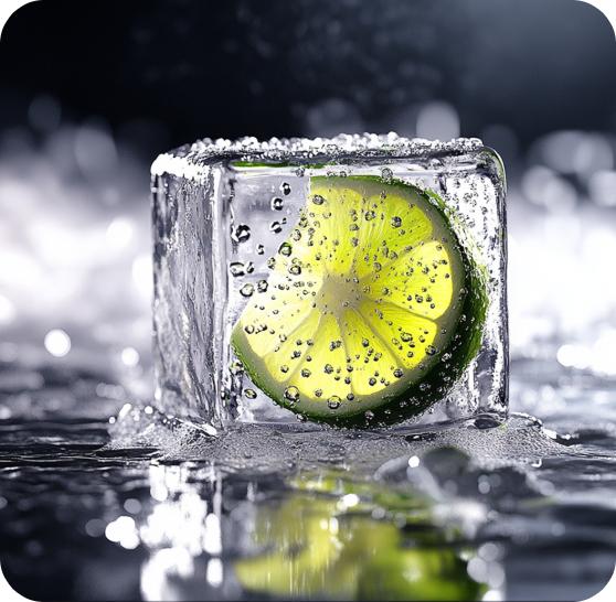 Photographic ice cube with lime inside, realistic ice, refractions and highlights, water drops, soft studio light, clean background, 8K. Try It