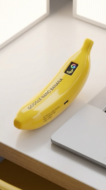 Draw Futuristic banana-shaped AI device «GOOGLE NANO BANANA», bright yellow plastic casing with English labels «ARTIFICIAL INTELLIGENCE», «EDGE COMPUTING», «NANO SERIES», small screen showing logo, charging port visible, on modern tech desk with laptop, soft diffused lighting, tech product photography, hyperrealistic. Try It