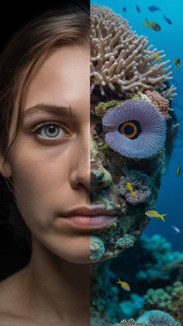 Extreme close-up of a face: one half — human skin, the other — a living coral reef. Tropical fish swim through the reef part, sea anemones instead of eyelashes, bioluminescent plankton glows in the pupil. Studio lighting, National Geographic quality. Try It