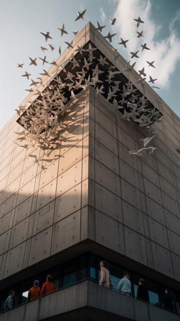 Brutal concrete building, its facade transforming right before your eyes into thousands of origami birds in flight. Some birds are still in the wall, some have already flown away. Golden hour, dramatic shadows. Below, people look up in awe. Surrealistic architectural photography. Try It