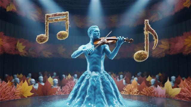 A violinist, who is completely made of flowing water, plays on stage. Musical notes materialize as golden sculptures, frozen in the air. The audience are silhouettes made of autumn leaves, and the concert hall walls are made of living corals. Dramatic spotlights, everything photorealistic. Try It